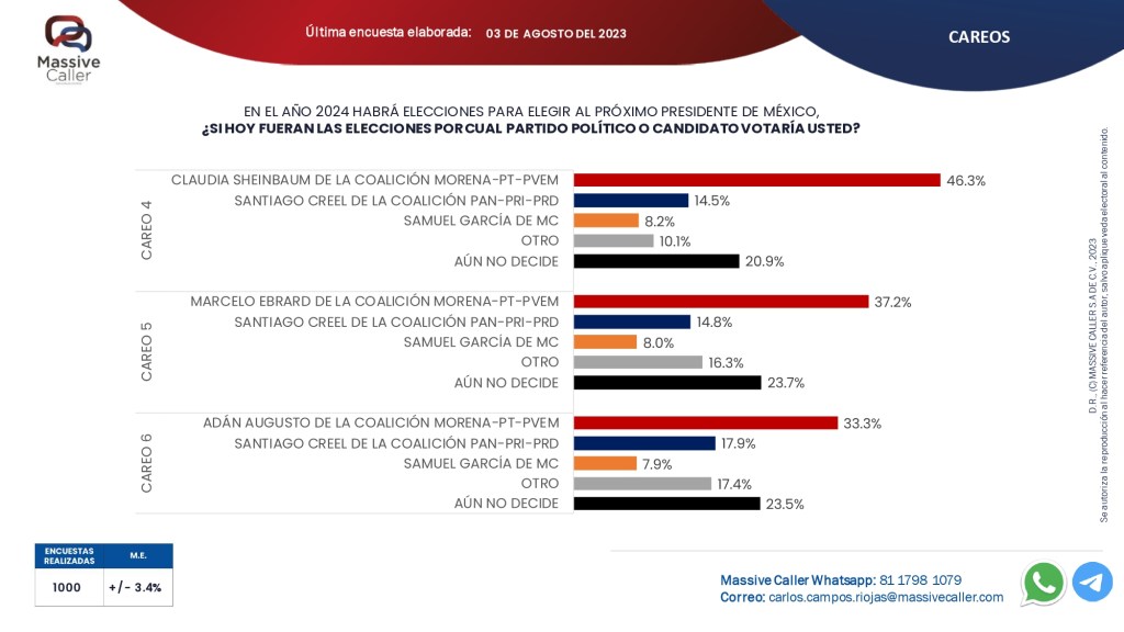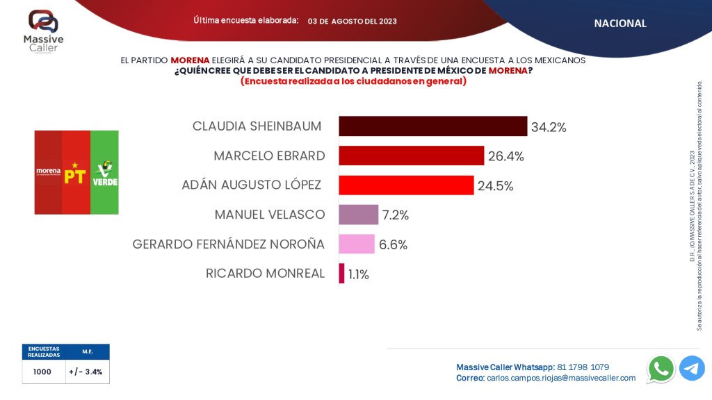 Las encuestas presidenciables según la casa encuestadora Massive Caller la coalición Morena, Pt, Verde obtiene un amplió liderazgo seguida por la coalición Pri, Pan, Prd.