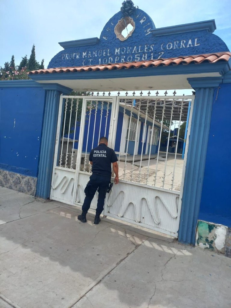 Como parte del operativo Vacaciones Seguras 2023, elementos de la Policía Estatal realizan recorridos de prevención y vigilancia por los diferentes planteles educativos, previo al regreso de clases con la finalidad de prevenir posibles robos a dichas instituciones.