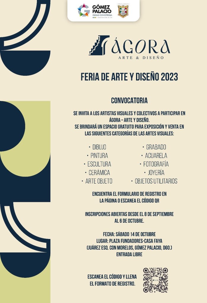 Con el objetivo de proporcionar un espacio a los artistas, creadores y emprendedores de Gómez Palacio y La Laguna en general, para que vendan, promocionen y den a conocer sus marcas, el Ayuntamiento, a través de la Dirección de Arte y Cultura, llevará a cabo la tercera edición de “Ágora” Feria de Arte y Diseño 2023