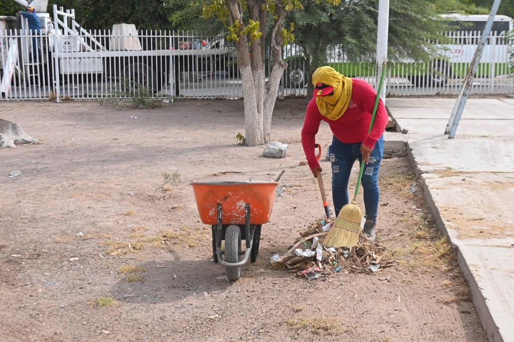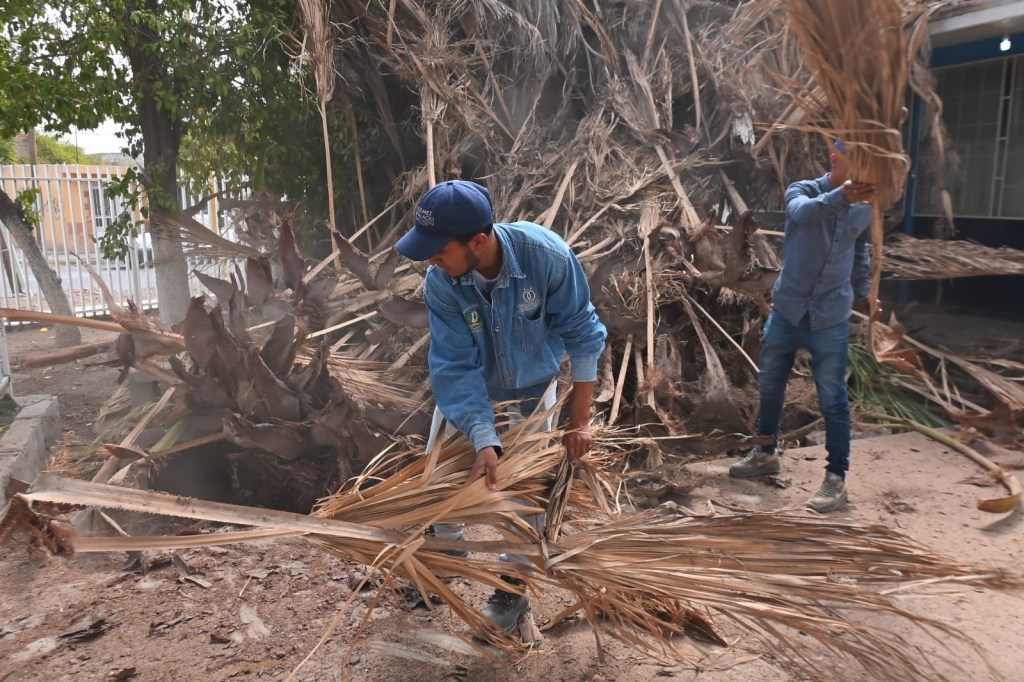 La Dirección de Servicios Públicos Municipales acudió la mañana de ayer a apoyar con labores de limpieza profunda en la escuela primaria La Esperanza, ubicada en la esquina de Francisco Villa y Forjadores, de la colonia Brittingham; donde además, realizaron la poda y el retiro de los residuos de una palma de más de 15 metros de alto, que se ubica al exterior del plantel.