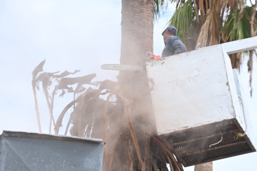 Para la poda de la palma, fue necesaria la utilización de una grúa con canastilla y una motosierra, además de un vehículo para retirar las hojas, que una vez en el suelo, ocupaban un volumen considerable.