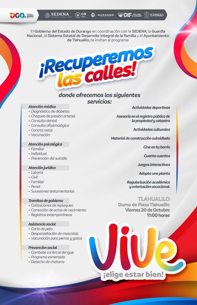 Recuerda que se tendrá atención médica gratuita,atención psicológica, atención jurídica, trámites de gobierno, asistencia social, actividades deportivas, presentación de la SSP Durango y demás dependencias de Gobierno Federal, Estatal y Municipal.