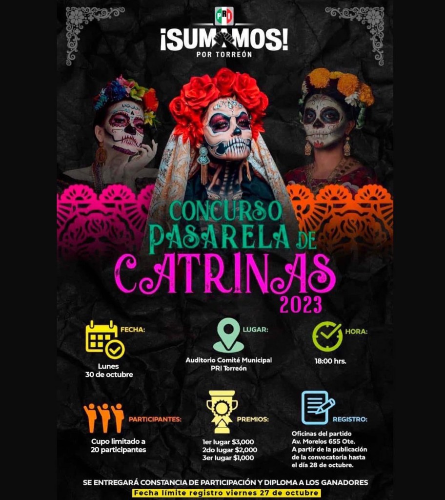Con el objetivo de conservar y promover las tradiciones mexicanas, el Comité Municipal del PRI en Torreón encabezado por Verónica Martínez, invita a participar en el el Concurso Pasarela de Catrinas 2023.