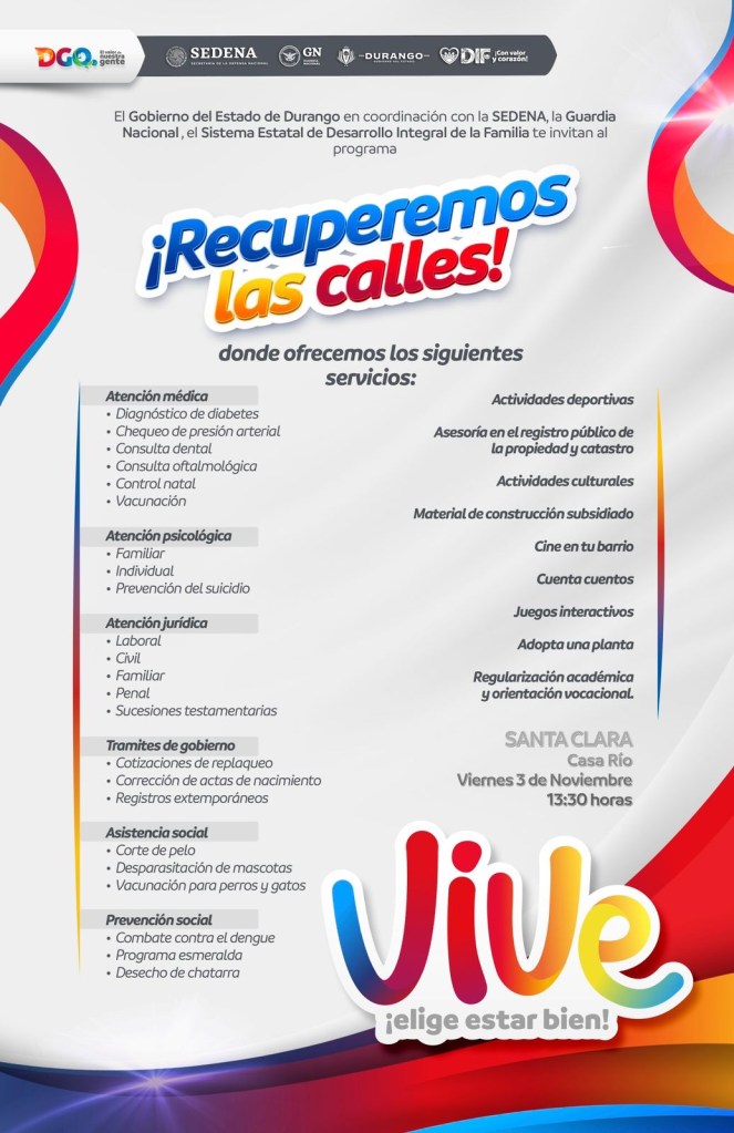 Señaló que están por concluir el recorrido por todos los puntos de la región Laguna de Durango: “El gobernador nos ha instruido para dejar la comodidad de las oficinas para ahorrar tiempo, dinero y esfuerzo, de los habitantes de cada uno de los municipios a los que llevamos el programa Vive”, concluyó.
