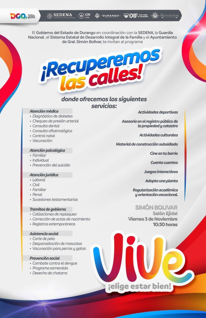 Finalmente, mencionó que cerca de 30 dependencias estarán presentes en Simón Bolívar y Santa Clara, tales como: la Secretaría de la Defensa Nacional, Guardia Nacional, Bomberos, Protección civil, Sistema para el Desarrollo Integral de la Familia DIF Estatal, DIF Municipal, Salud, Recursos Naturales y Medio Ambiente, Educación, Recaudación de Rentas, Administración, Subsecretaría de Gobierno, Bienestar y Desarrollo Social así como instituciones educativas: DIES8, UNIPOLI, COBAED, IESEN, UTL y Derechos Humanos, entre otras.